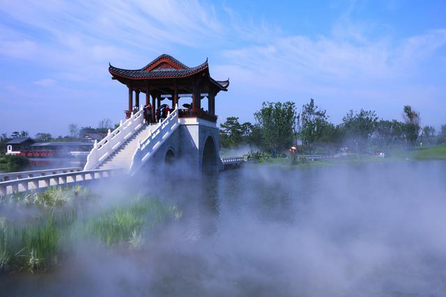 在亭台楼阁休闲一角也能体会到雾森系统的魅力!雾从桥下升腾而出,朦朦薄雾,宛若仙女身上的纱带,在袅袅飘动。轻轻抓一把,软绵绵的白雾顷刻间消失不见,留在手中的只剩下冰冰凉凉的触感。
